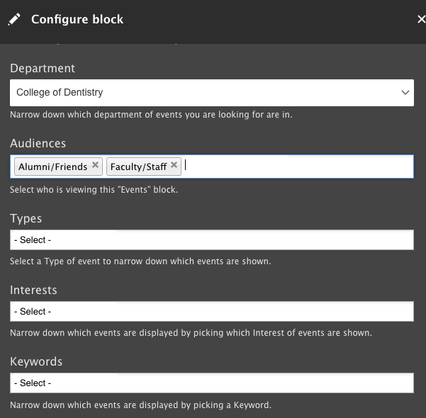 The "Events" component is perfect for highlighting multiple events that have a broader appeal. If you’re dealing with a series of events or those relevant to a larger audience, it’s best to connect them with the UI Events Calendar. This platform showcases a wide range of campus events and lets users filter by categories to find what interests them.